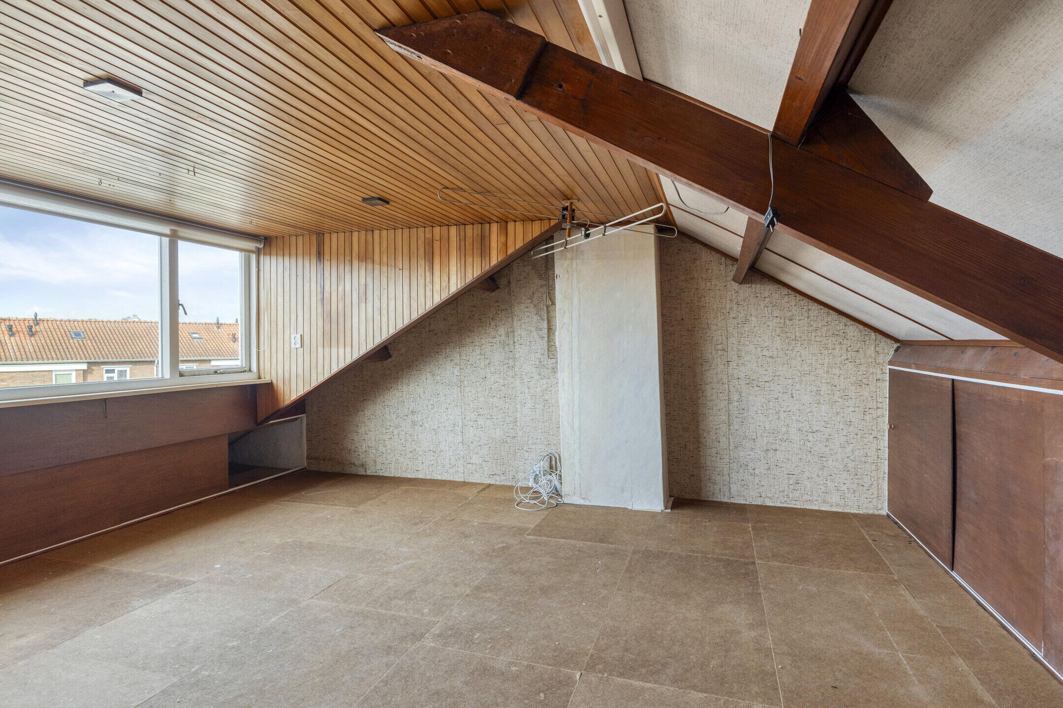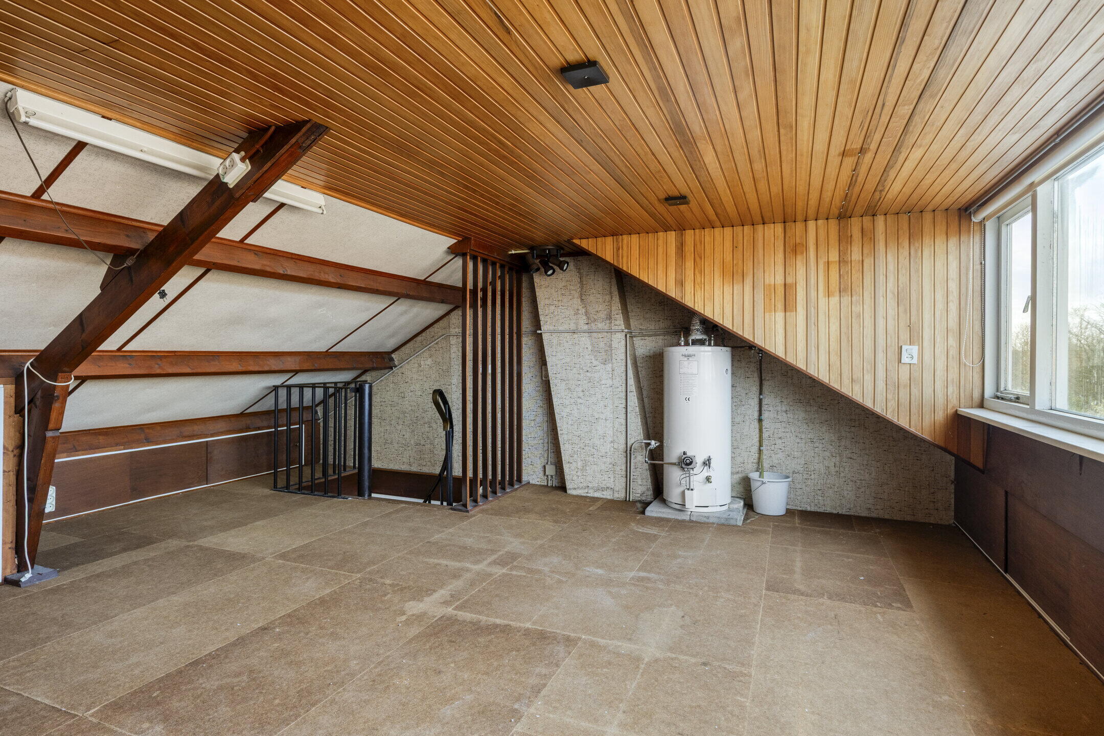 De zolderverdieping bestaat uit één grote open ruimte met voldoende bergruimte achter de knieschotten. Hier zijn diverse mogelijkheden, zoals het creëren van een extra kamer of werkruimte.