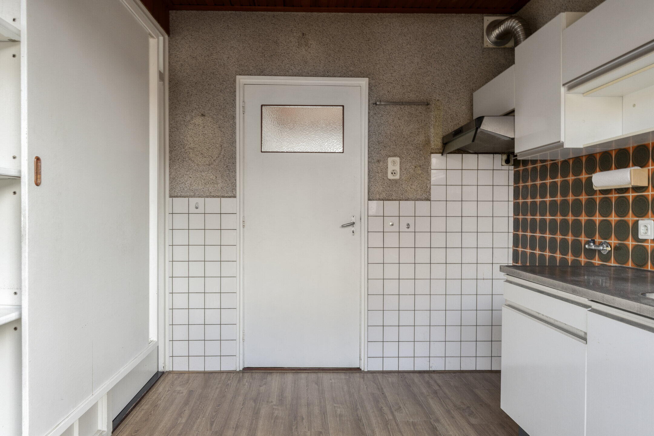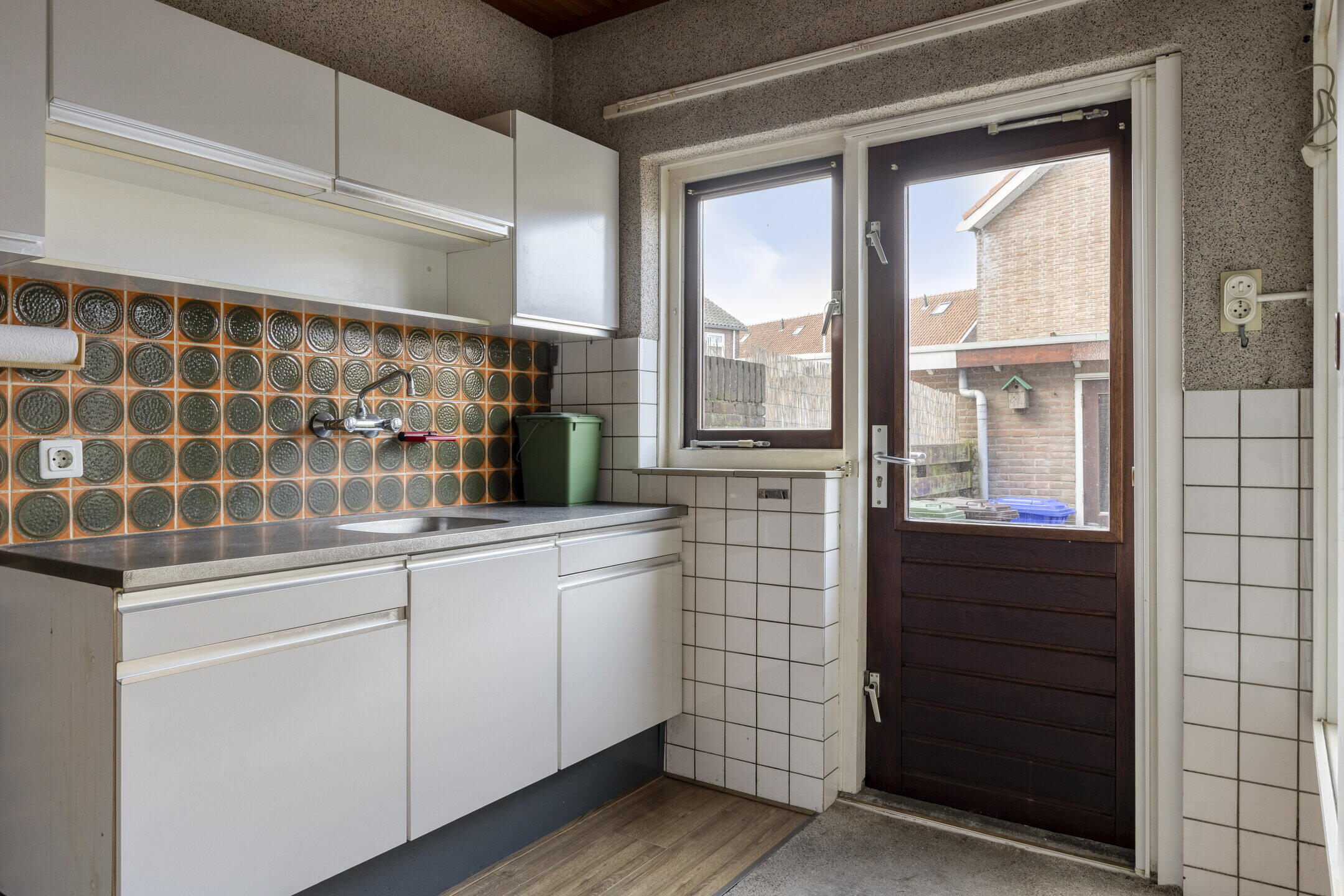 De eenvoudige keuken bevindt zich aan de achterzijde van de woning en beschikt over een openslaande deur naar de tuin en is eenvoudig met de woonkamer te verbinden.