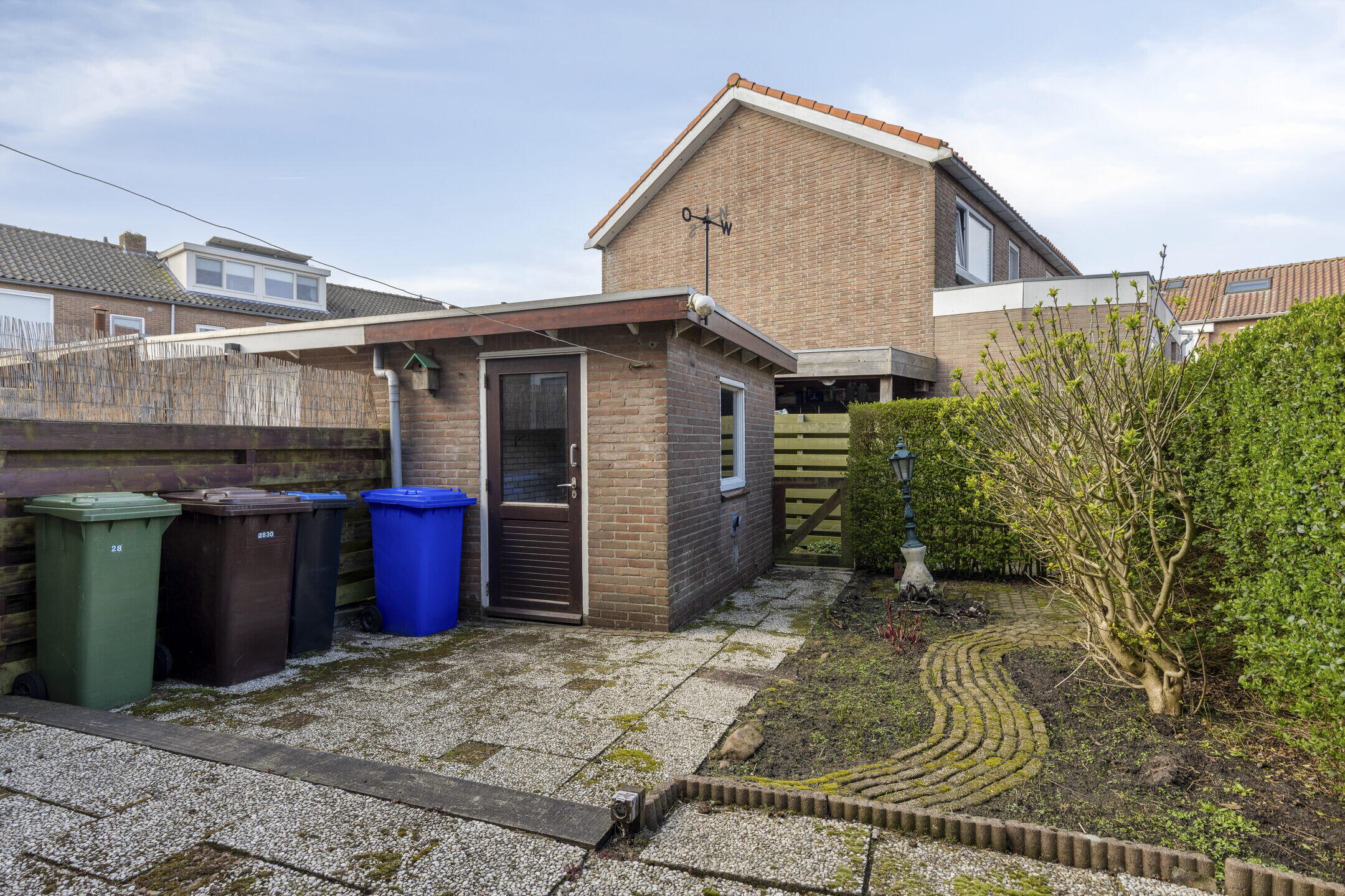 De zonnige achtertuin is een fijne plek om te ontspannen en is voorzien van een stenen berging.